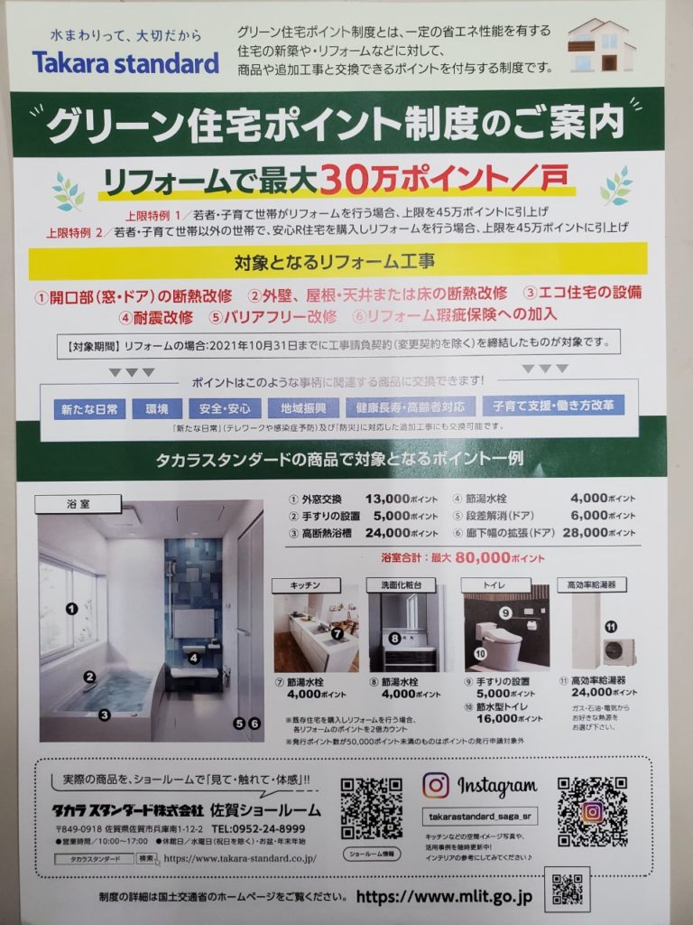2021.03.09 お知らせ グリーン住宅ポイント制度 2020年12月15日から2021年10月31日まで グリーン住宅ポイントの対象期間内です。 対象のリフォームをされた方にグリーン住宅ポイントが発行されます。 当社ではお手続きのお手伝いをすることが可能ですので、お気軽にご相談下さい。 対象であるかどうかお調べすることもできます。 back