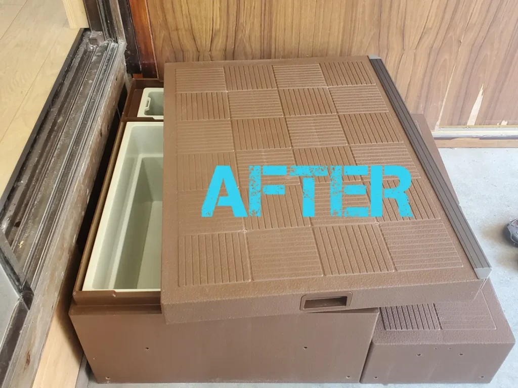 上り段を新しくする際には、JOTOのハウスステップを採用しましたので、収納の中に防災グッズを入れておくことも可能です。